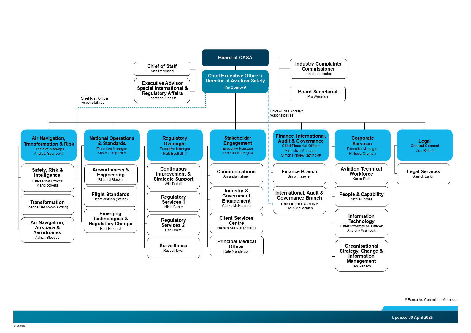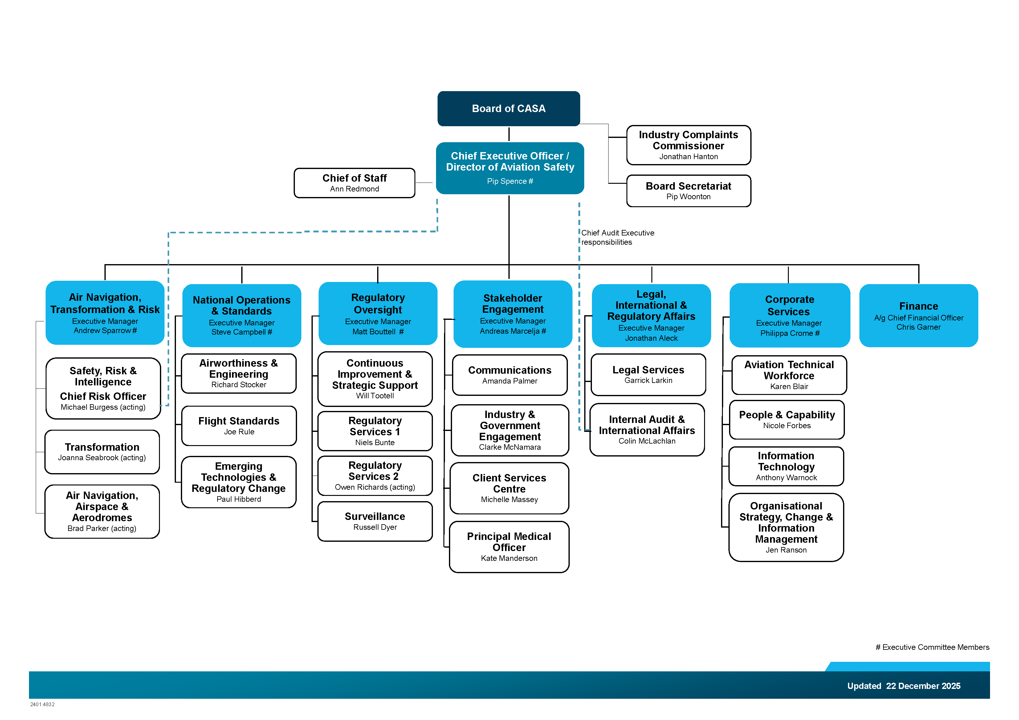 The Chief Executive Officer (CEO) and Director of Aviation Safety (DAS) manages CASA in line with the Board’s directions and policies.