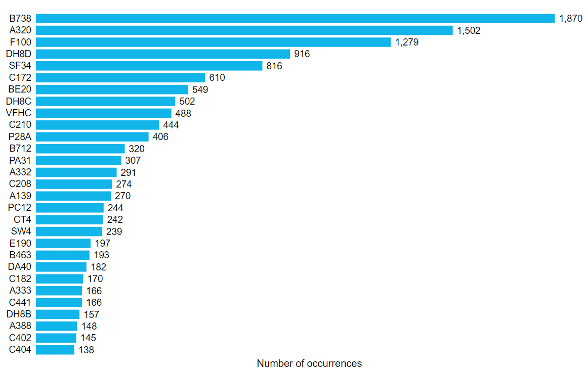 The most common aircraft models for technical occurrences from 2014 to 2025 were:
